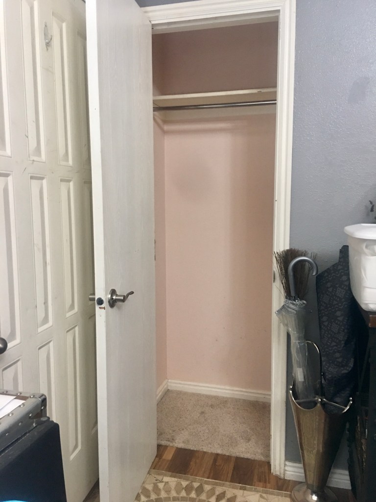 You will need matching heavy duty hangers, coats are not lite. 3-4 baskets or bins for the top shelf, to hold hats, scarves, gloves, compact umbrellas, etc… and an umbrella stand in the corner of the closet floor. (Only if you have full length umbrellas 🌂).