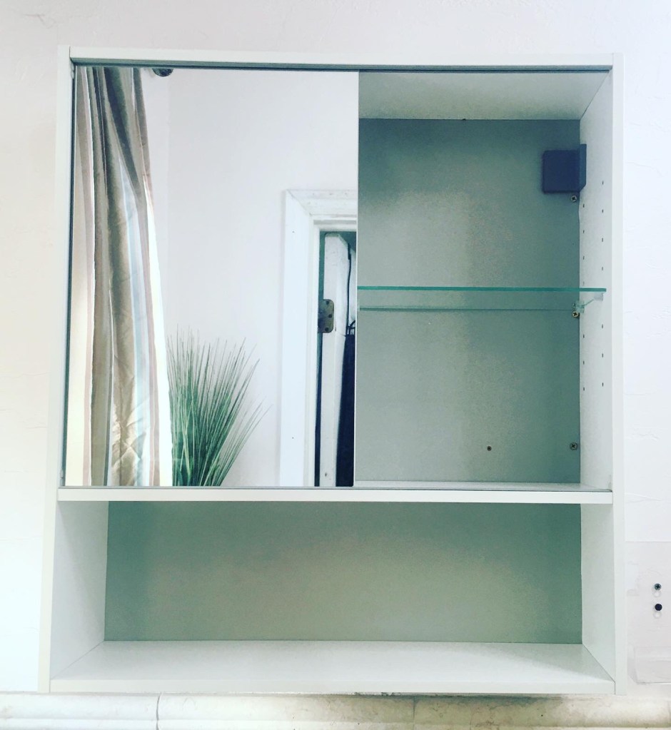 Step one: empty cabinet and wash shelves, mirrors, and walls.